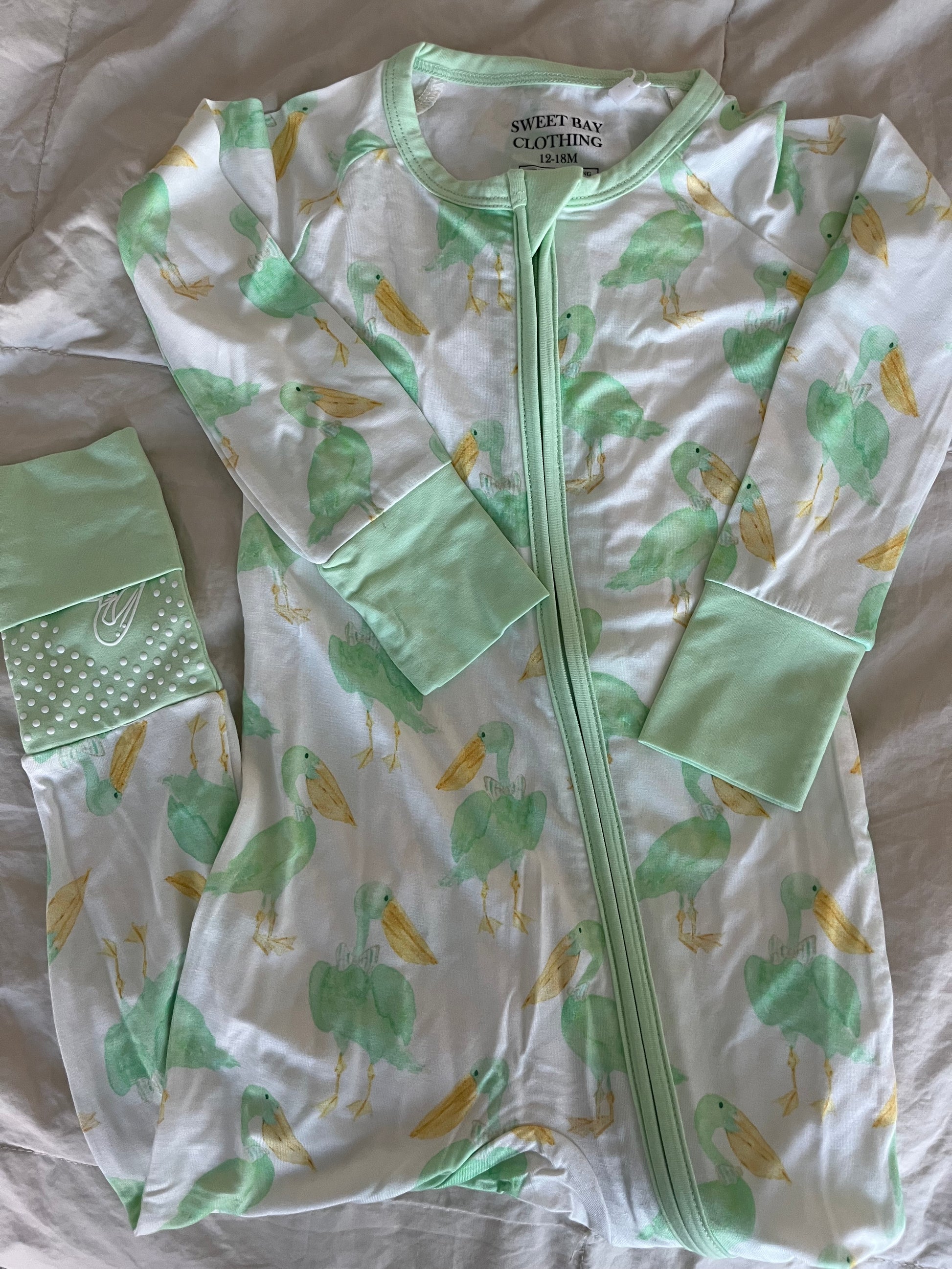 * Mint Pelican on White watercolor design * Made from soft, stretchable fabric 95% viscose from bamboo, 5% spandex * Double zipper for easily accessible diaper changes * Tag-free for delicate skin * Fold-over footie option for sleepwear * Fold-over hand mittens to prevent scratches * For child's safety, sleepwear should fit snug * Runs big, size down for a snug fit